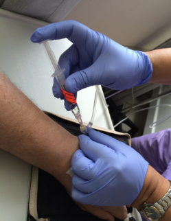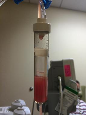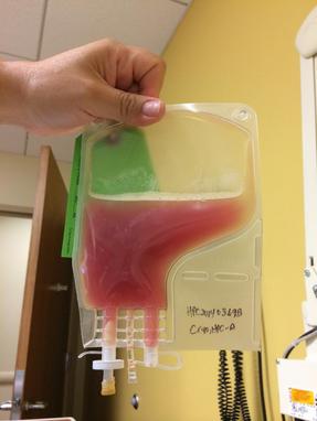 El proceso de colección de las CM es similar al de diálisis. Me sacan la sangre (a través del catéter), pasa por una máquina que separa las CM y me devuelve la sangre al cuerpo. Coleccionan suficientes CM como para 2 trasplantes y las congelan.