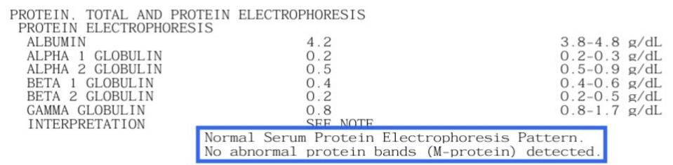 “Normal Serum Protein Electrophoreses Pattern. No abnormal protein bands (M-protein) detected.”